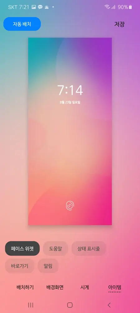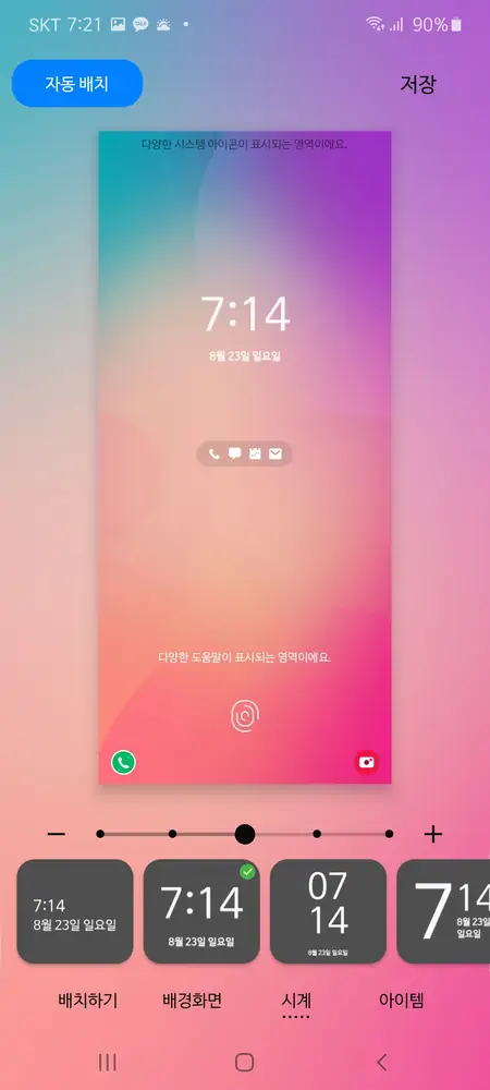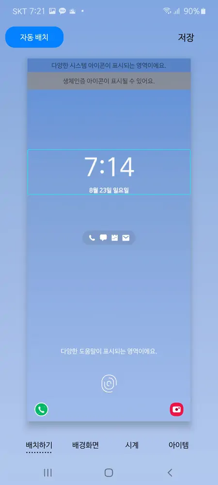 LockStar를 이용해 잠금화면에 위젯을 배치할 수 있다. 또한 좌측 상단의 자동 배치를 눌러 위젯을 자동으로 배치할 수도 있다. 그리고 잠금화면의 배경화면도 설정할 수 있다.