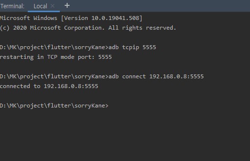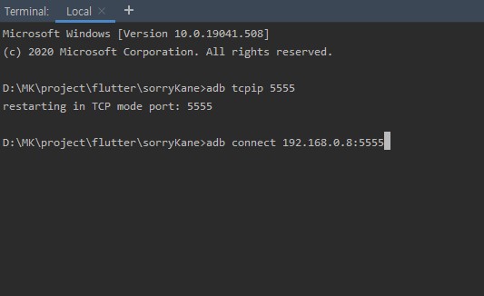 에뮬레이터의 IP 주소를 확인했으면 다시 안드로이드 스튜디오로 돌아오자. 터미널에 adb connect ip주소:5555를 입력하면 에뮬레이터와 무선으로 연결된다.