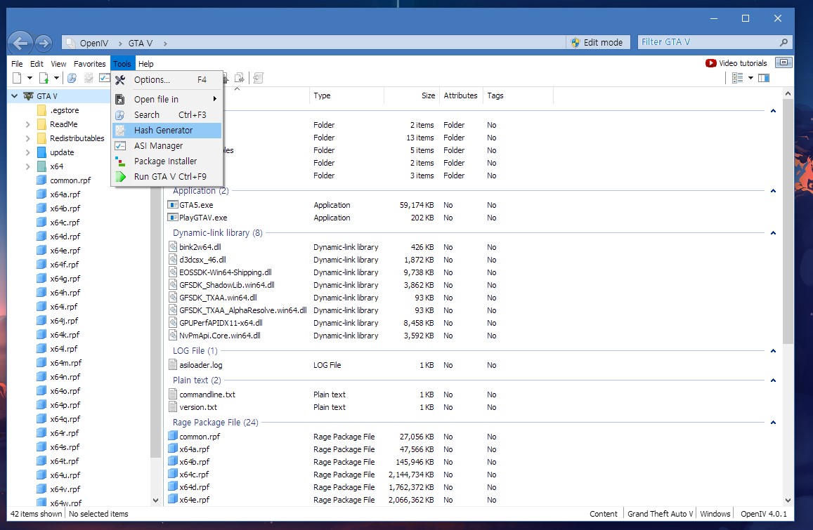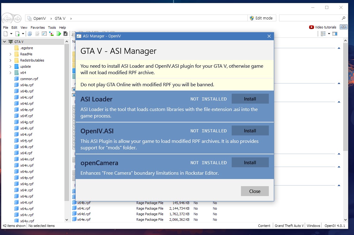 모드를 적용하려면 ASI Manager에서 ASI Loader과 OpenIV.ASI 두 개를 설치해야 한다. ASI Manager은 Tools 탭에 있다. 참고로 설치 시간을 오래 걸리지 않는다.