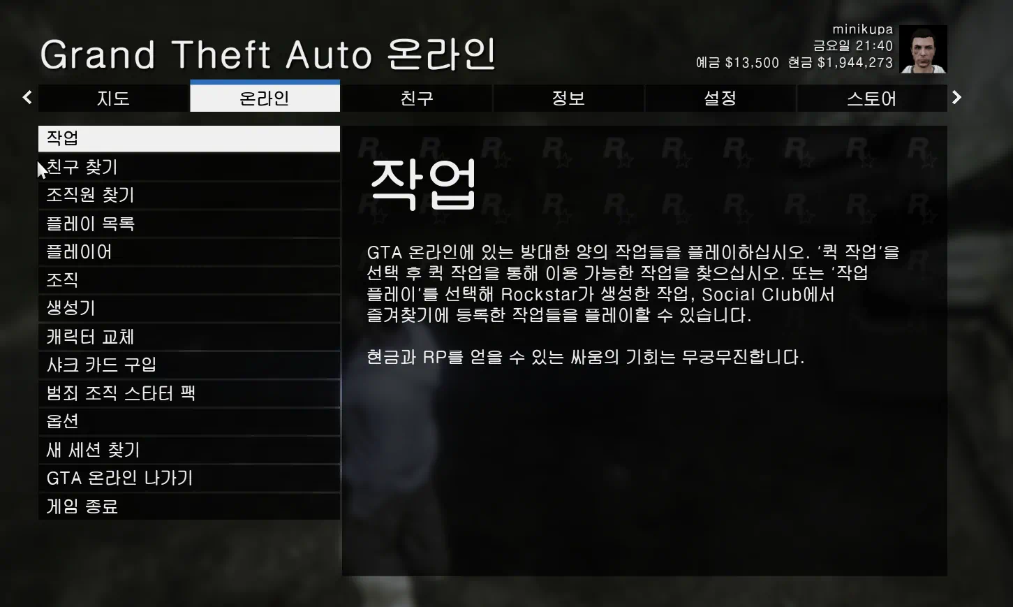 활성화된 작업이 없다는 창이 뜨면, ESC를 누르고 GTA 설정 창으로 들어간 후 온라인 탭으로 들어가자. 여기서 옵션 탭을 클릭한 후 메치 메이킹을 닫힘으로 두면 다시는 저 창이 뜨지 않는다.